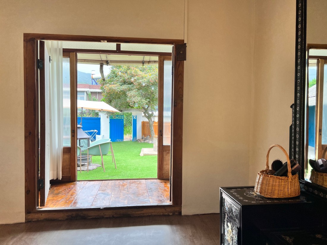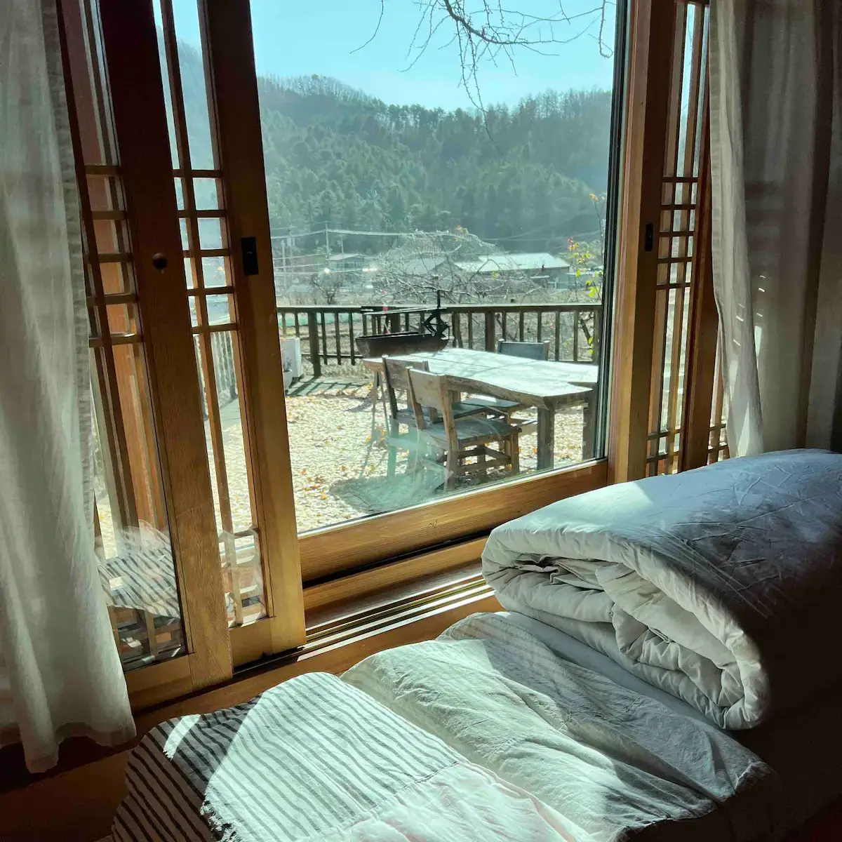 모원당 앞마당에 펼쳐진 드넓은 논과 그 뒤로 보이는 산을 바라보면, 촌캉스에 가장 잘 어울리는 공간이 바로 이곳임을 실감하게 됩니다. 레트로한 감성의 한옥과 청정자연까지 동시에 즐길 수 있는 최고의 힐링 장소입니다.