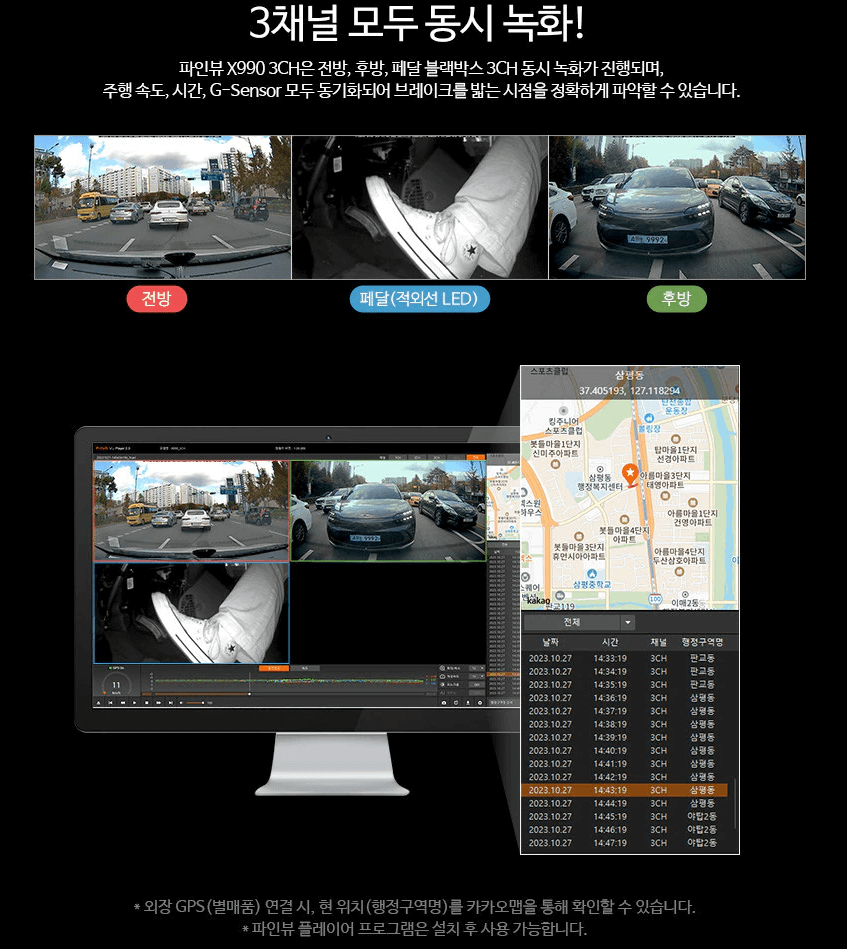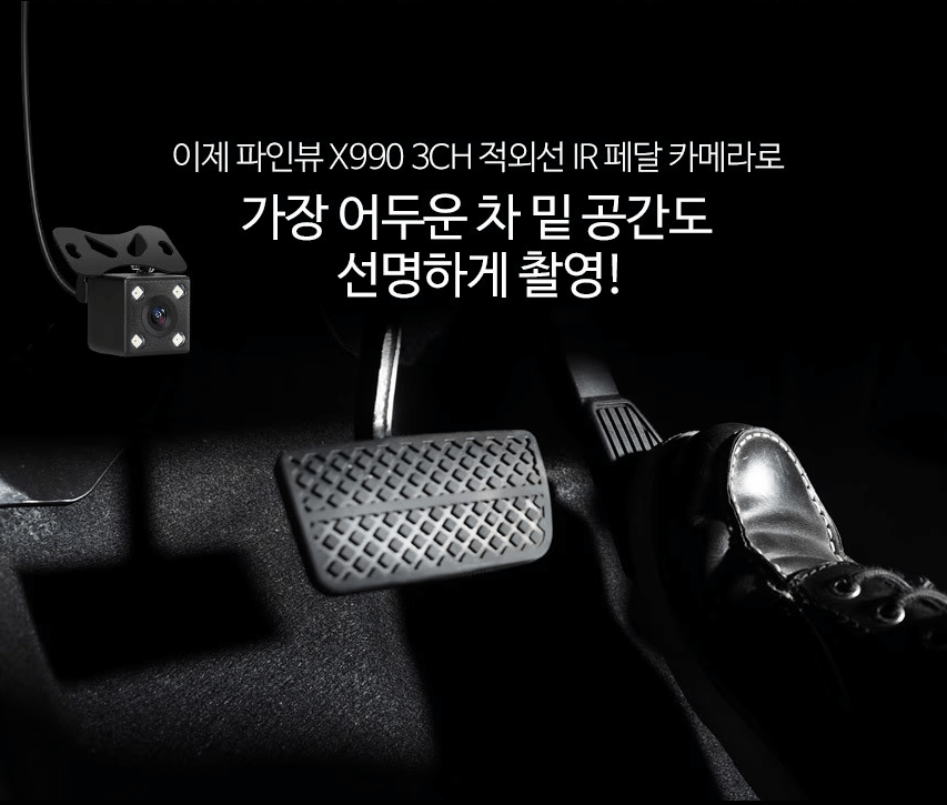 파인뷰 X990 3 채널은 전방, 후방, 페달을 동시에 FHD 초고화질로 녹화하여 모든 사고 상황을 기록합니다. 적외선 페달 가케라와 오토 나이트 비전 기능이 탑재되어 있어 어두운 환경에서도 선명한 화질로 영상 녹화가 가능합니다.