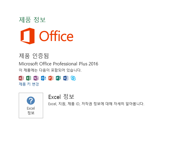 엑셀을 실행하신 후, 파일 - 계정 - 제품정보를 확인하시면 됩니다. 정상적으로 인증이 완료된 경우, 아래와 같은 화면이 나옵니다.