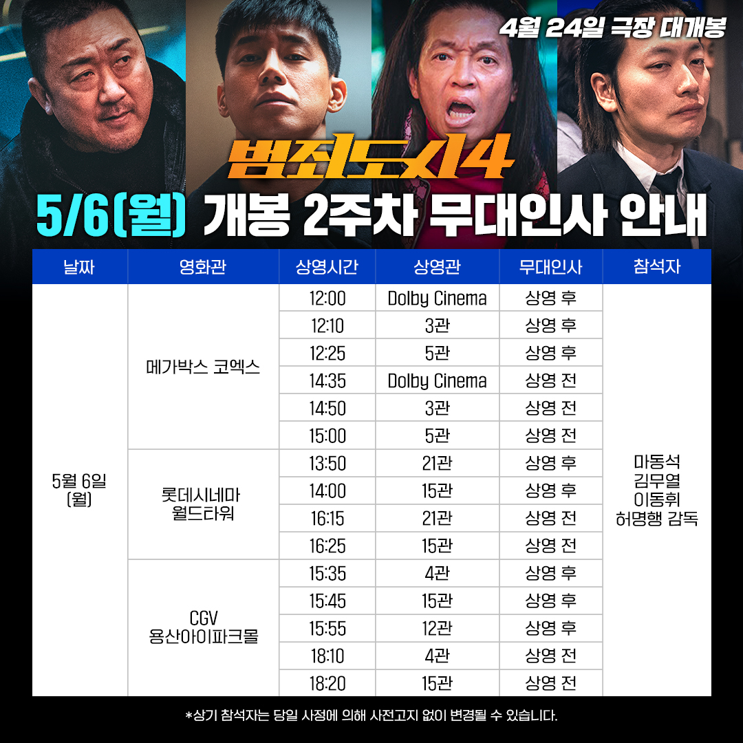개봉 2주 차 무대인사는 5월 4일 ~ 5월 6일, 3일간 진행될 예정이니 서둘러서 예매하세요!!