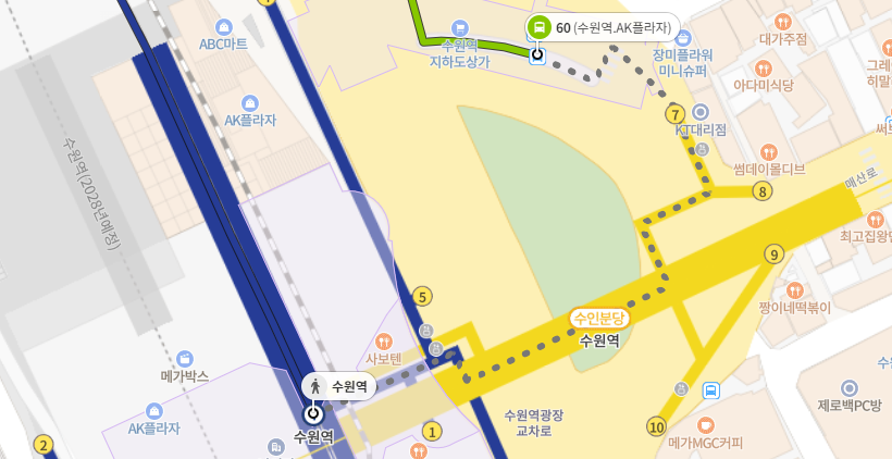 - 수원역 7번 출구에서 도보로 수원역 AK플라자까지 이동 한 다음, 버스 환승 후 화성행궁 정류장에서 하차